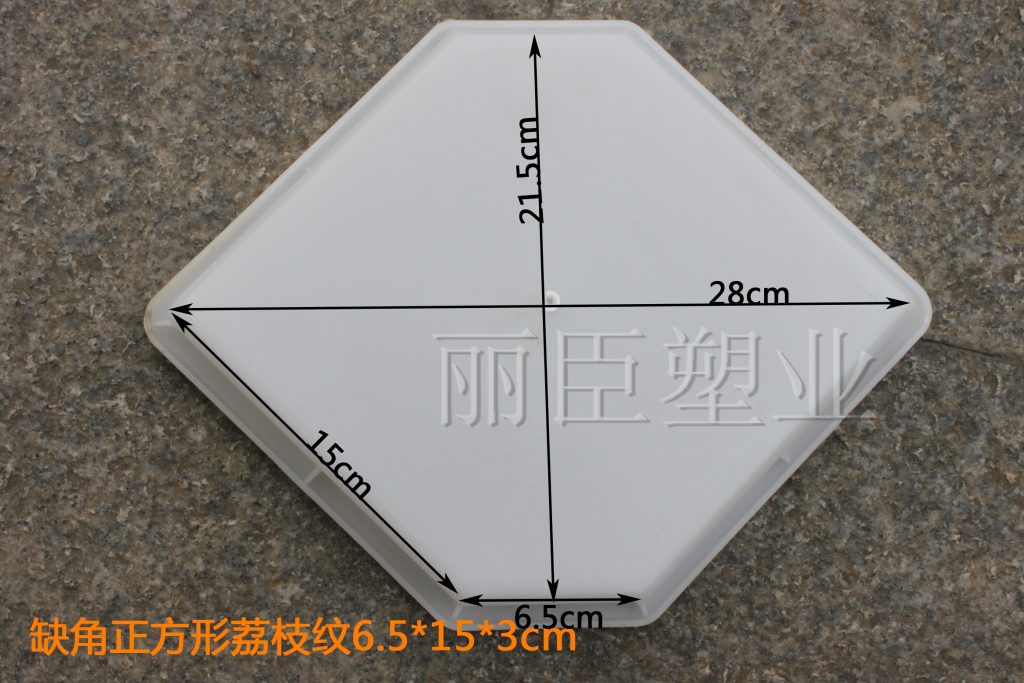此產品專供西安客戶的一款彩磚模具,主要結構以正方形缺角形狀設計,其中底部為荔枝紋圖案,即所預制水泥彩磚成品表面為防滑荔枝紋圖案。此西安彩磚模具對角對稱長度為28CM,缺角對稱長度為21.5CM,詳細見下圖。