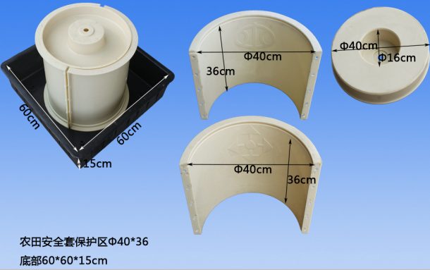 這是一款造型非常獨特的農田保護區水利模具,主要分為三個部分:底座為黑色正方形結構類似平石一樣的塑料模具,裝載圓筒部分及圓筒上蓋部分。