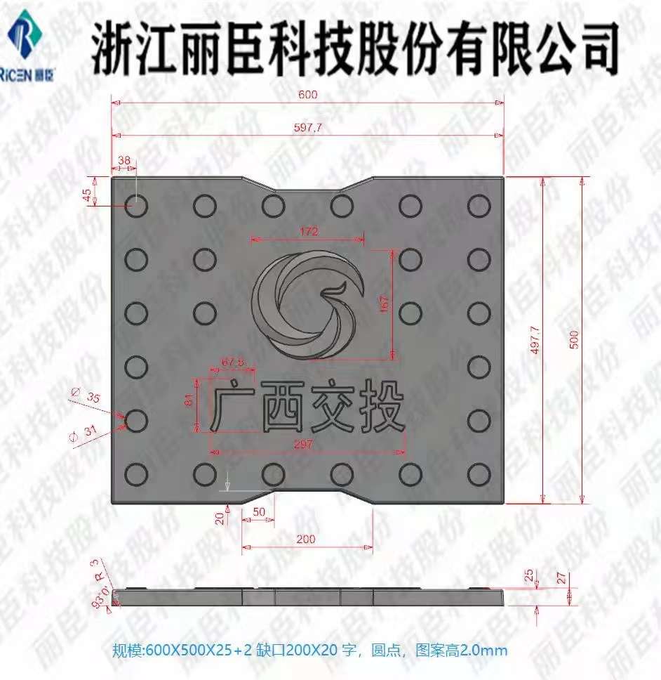 模具主要用于廣西高速,模具擁有三個(gè)尺寸:80x50x2.5、75x50x2.5、60x50x2.5,模具整體都采用ABS材質(zhì)制成,模具板面為缺口圓點(diǎn),帶廣西交通投資集團(tuán)標(biāo)志,底部有“廣西交投”四字,模具尺寸薄,主要用于RPC材質(zhì)的預(yù)制成型。
