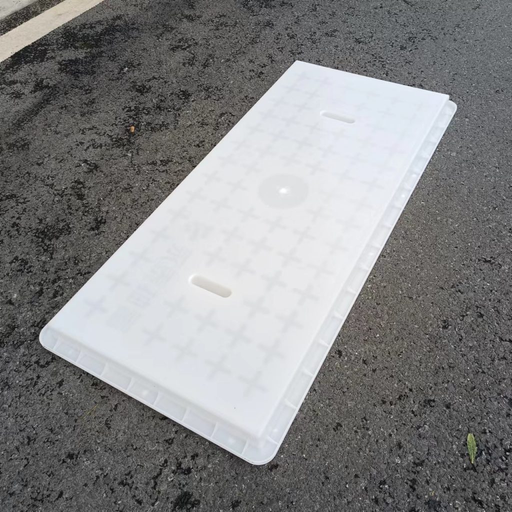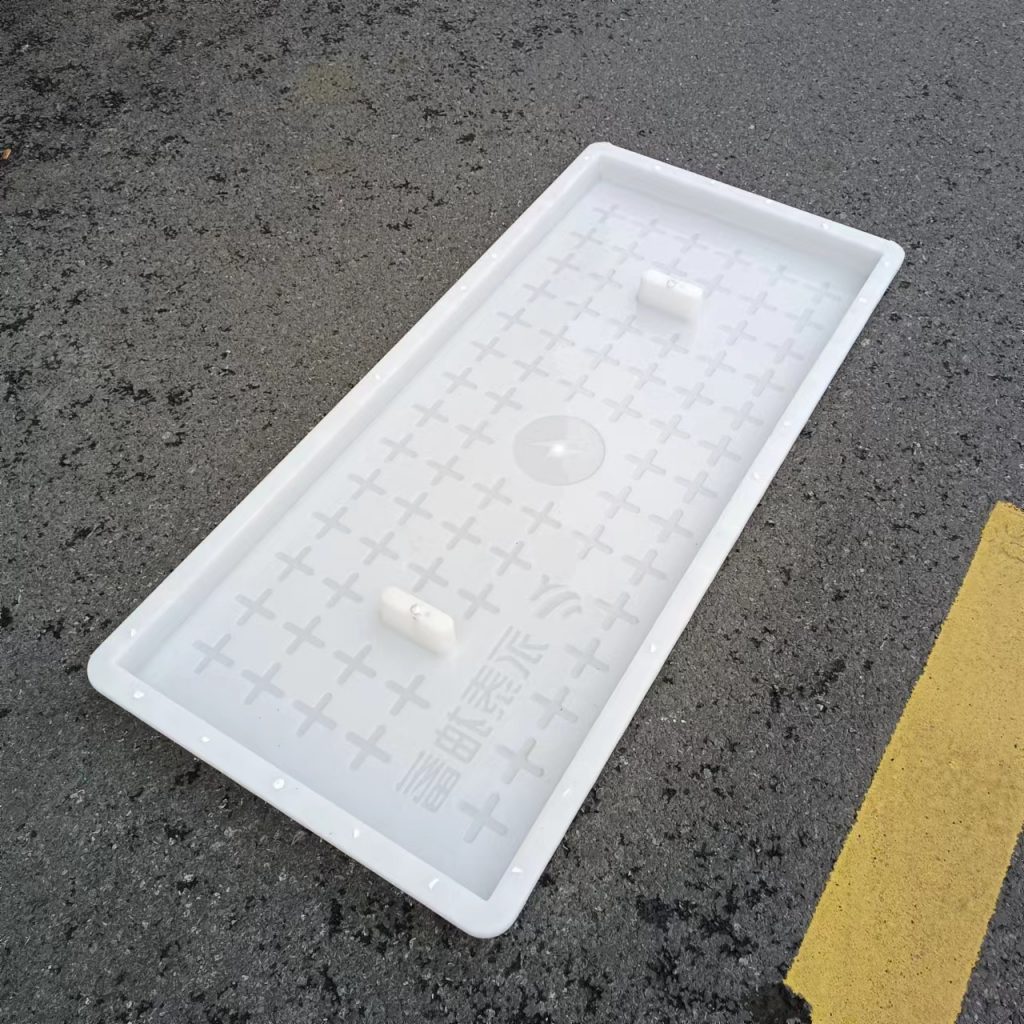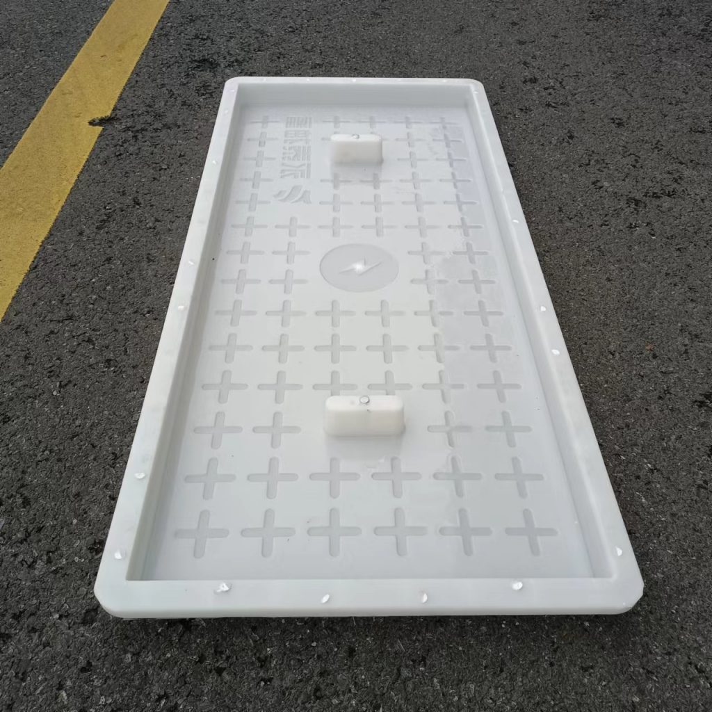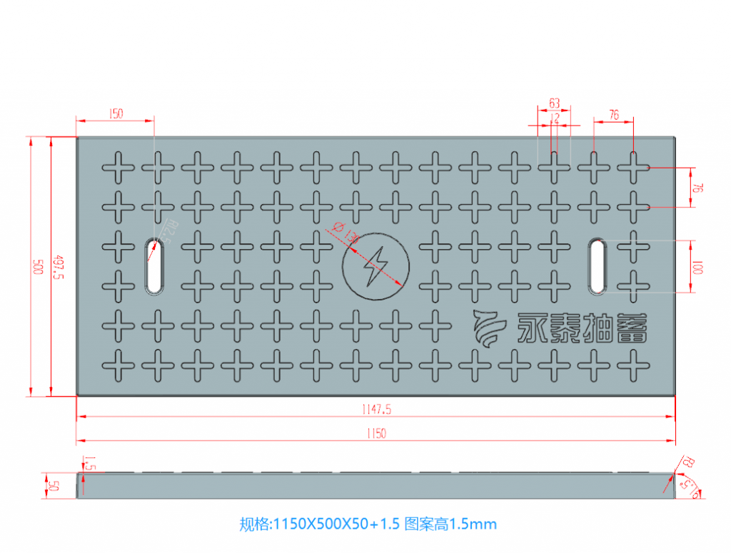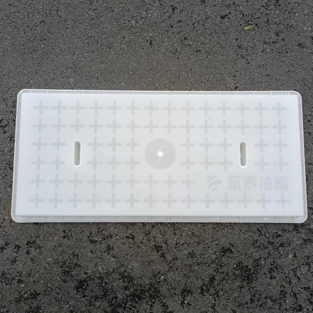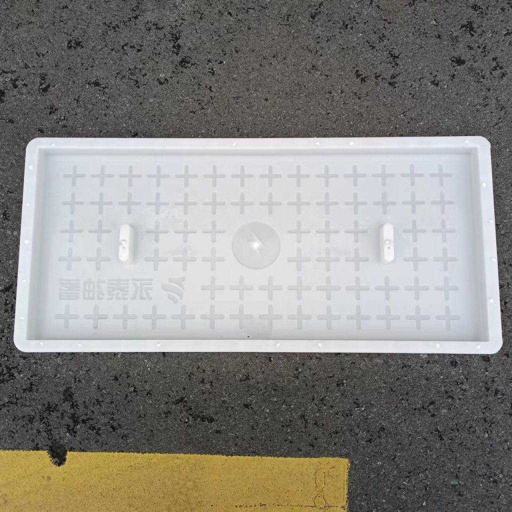 產品為米白色pp材質制成,版面帶十字花紋,中心帶有電力標志,兩側帶二孔,方便提拉,右下角帶有“永泰抽蓄”四字,為客戶定制產品,模具尺寸還有90cm長度,里面花紋基本一至,預制成型后電力蓋板。