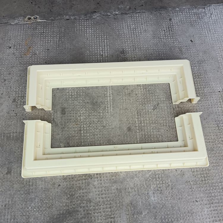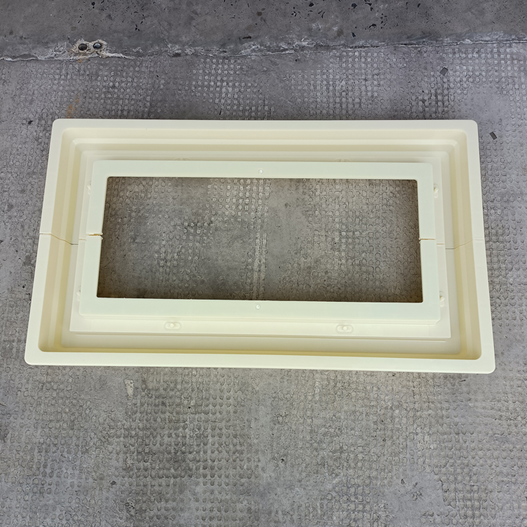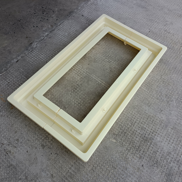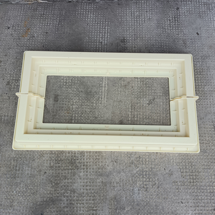 方井座塑料模具,模具采用拼接方式、為兩個組裝而成、寬度可以增加調節,有設配件井座B,該長度、寬度尺寸為模具尺寸最外邊、包括翻邊。